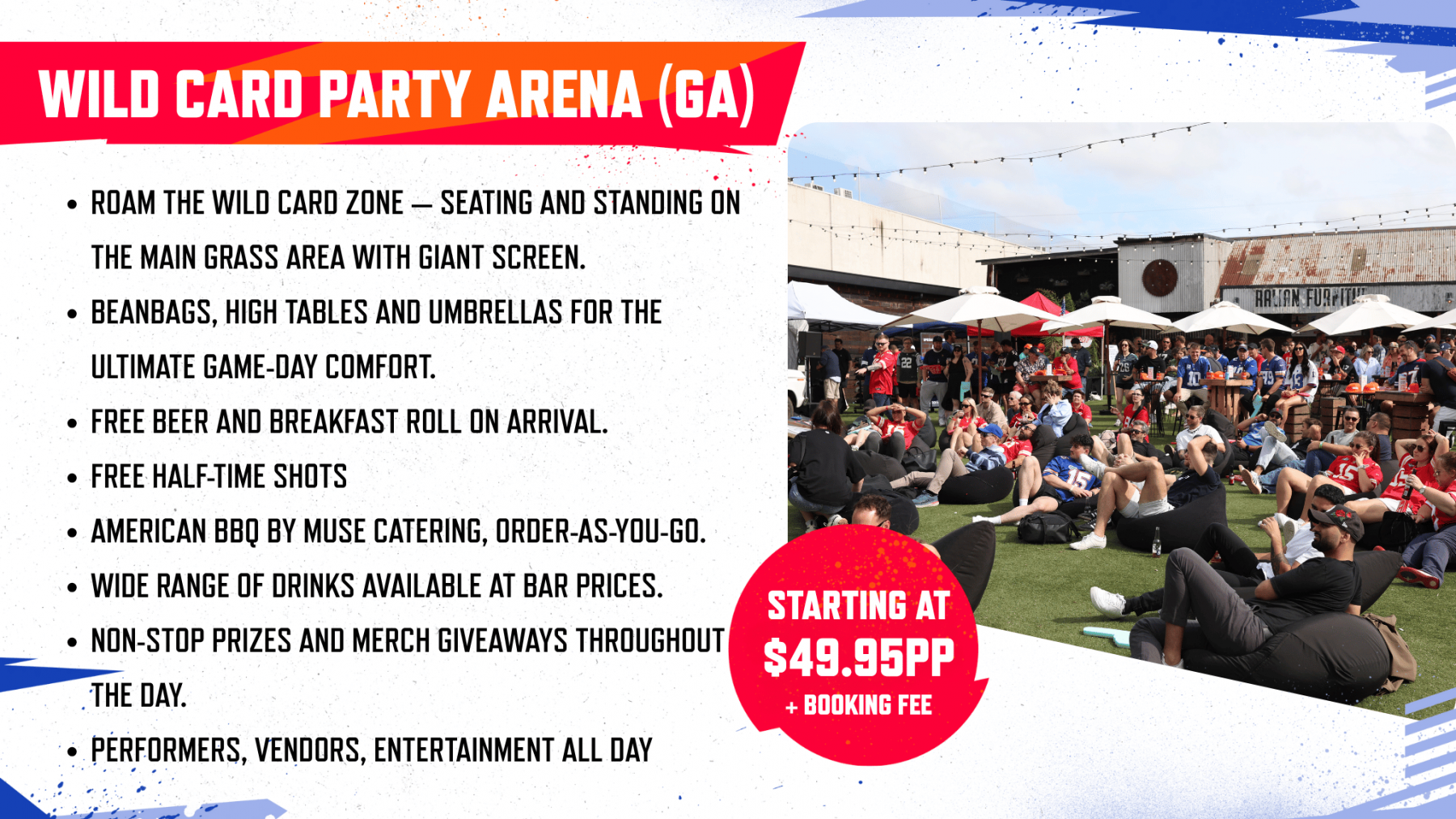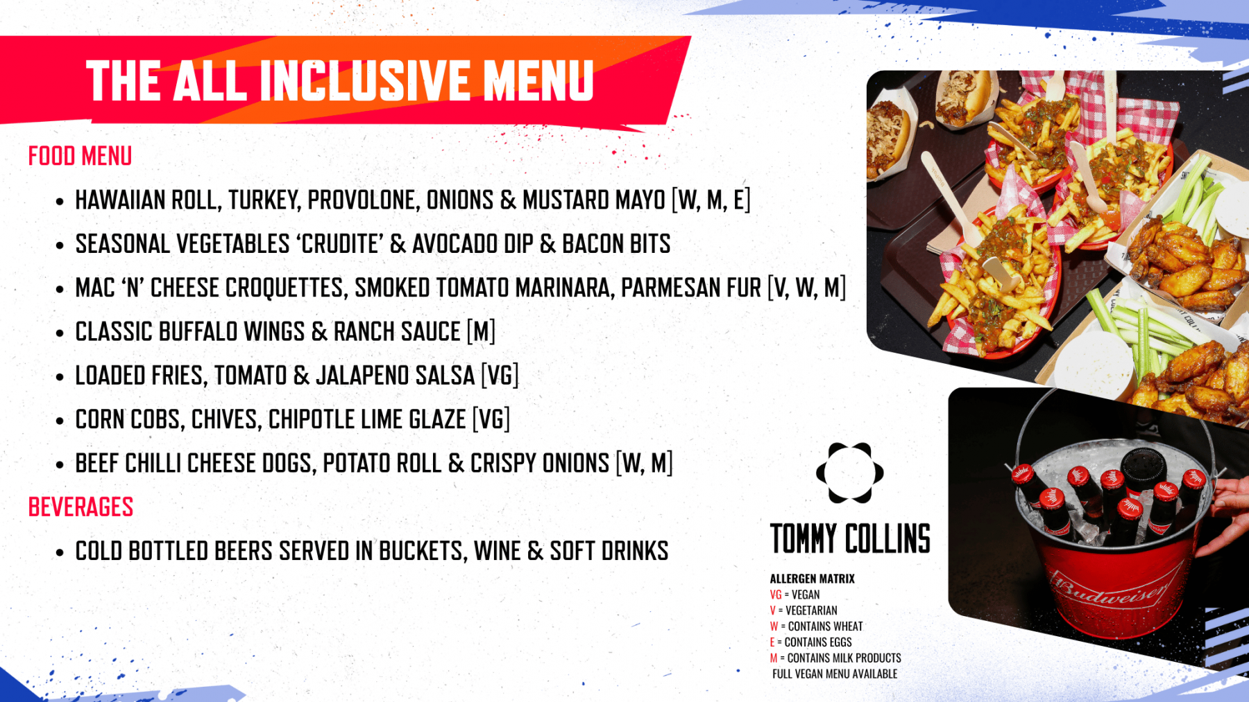Tommy Collins returns with the ultimate game-day feast for our All-Inclusive Table guests, while Muse Catering fires up the BBQ in the Wildcard Party Arena with authentic American smokehouse favourites.